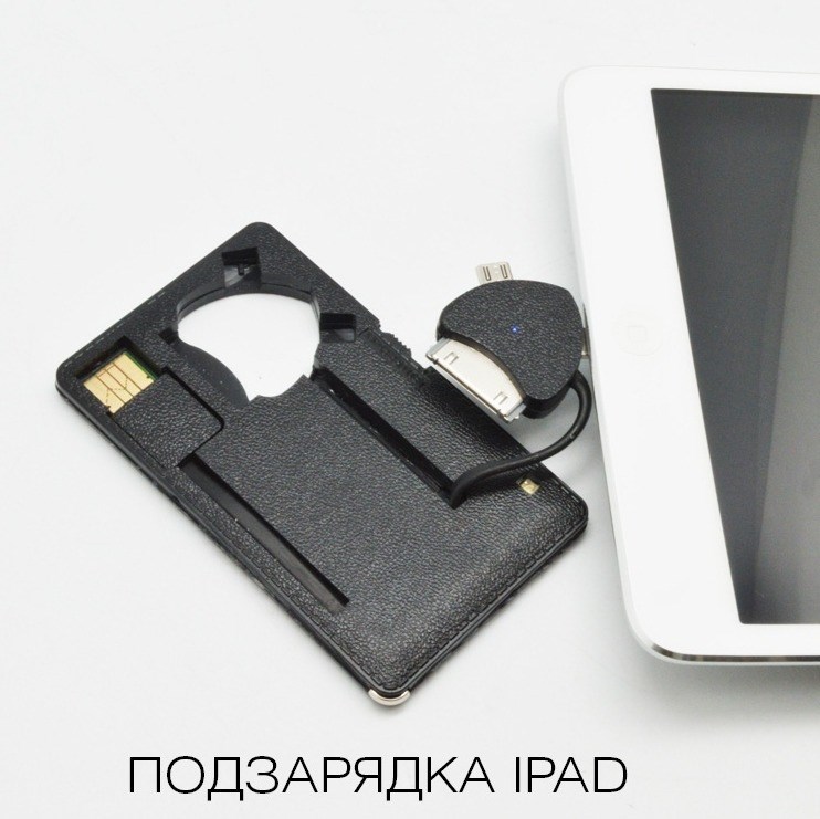 Описание Power–флешка - компактное устройство, которое объединило в себе функции: зарядного кабеля; мини power bank; флеш-накопитель для смартфонов, плееров, планшетов, наушников и прочих гаджетов. Комплектуется microSD картой 8 ГБ и содержит коннектор Micro USB, Apple 30 и Apple Lighting. Ваш телефон или планшет разрядился и при этом необходимо сделать срочный звонок, скачать необходимый документ или же просто остаться на связи? Подобная проблема возникла в дороге, на работе или в других ситуациях, когда воспользоваться зарядить гаджет негде? Но при этом обычный Power Bank для Вас слишком тяжел и громоздок? Решение есть: Power-флешка - многофункциональное мобильное устройство, которое с легкостью поместится в Вашем портмоне или кармане. Преимущества Power–флешки: возможность оперативной подзарядки Вашего мобильного устройства без доступа к электросети; полная зарядка разных устройств от USB; чтение / запись карт microSD; проигрывание MP3 песен в машине через USB; полезный подарок; универсальность – подходит для зарядки большого спектра различных мобильных устройств от игрушек до беспроводных наушников и Bluetooth гарнитур. стильный дизайн, разные цвета. В каких случаях вы сможете использовать Power-флешку: Для экстренной зарядки мобильных устройств, то есть Вы сможете сделать нужный звонок или отправить необходимое письмо, даже если у Вас разрядился аккумулятор. Заряда в 600 мАч хватит для подзарядки смартфона до 20% (iPhone4S). Этого достаточно для 2-х часов разговоров (iPhone4S в сетях 2G-3G) на десятки часов работы в режиме ожидания или на 2 часа работе в интернете по Wi-Fi. Кроме зарядки мобильных устройств данный гаджет может использоваться для хранения и чтения различных файлов с входящей в комплект MicroSD карты размером 8 Гб дискового пространства будет достаточно для хранения нескольких тысяч фотографий, сотен MP3 песен, нескольких фильмов или множества других необходимых данных. А также, как зарядный кабель-коннектор для различных устройств (есть переходники micro USB, Apple 30 и Apple Lightning). Технические характеристики: Время зарядки 2 часа; Выходное напряжение 5В / 1А; Micro USB ридер: встроенный; Интерфейс заряда: Micro USB, Apple 30 и Apple lighting; Напряжение 5В / 350 мА; Размеры 92х55х6 мм; Объем памяти 8 Гб; Цвет чёрный; Энергоемкость аккумулятора 600 мАч, литий-полимерный; Вес 20 г.