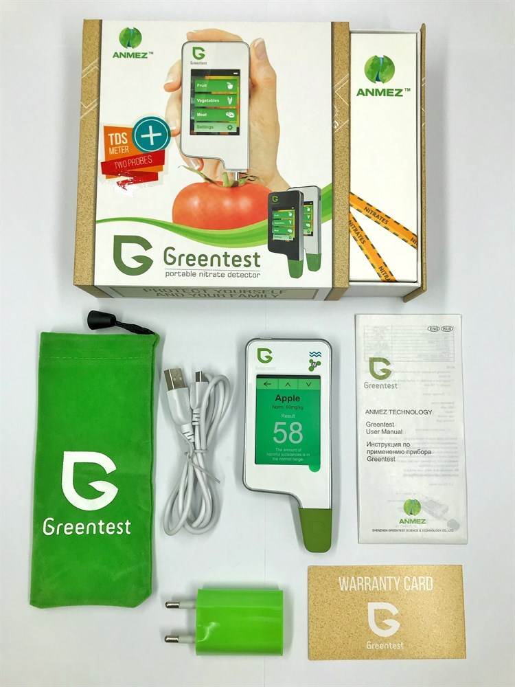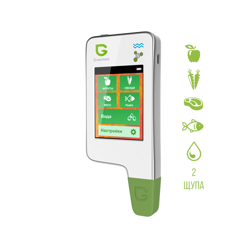 Описание Greentest 3 измерит уровень нитратов в овощах, фруктах, мясе и рыбе, а также оценит качество питьевой воды всего за несколько секунд. Следить за своим питанием теперь стало намного проще! Компактный размер Сенсорный дисплей Тонкий двойной щуп (не оставляет следов после измерения) Более 60 продуктов питания в памяти устройства Тестер жесткости воды Что такое Greentest 3? Неважно, как выглядят фрукты и овощи – в них всегда могут содержаться опасные для здоровья вещества. То же относится и к мясу. Качество воды – ещё одна острая проблема современности: даже если у вас стоят фильтры, вы точно помните, когда их меняли последний раз? Может, они работают не так хорошо, как вам хотелось бы? Поможет разобраться в этом удобный и компактный нитрат-тестер Гринтест 3! Всего 3 секунды – и вы точно знаете, пригодна ли для употребления местная вода или безопасны ли овощи, из которых вы собирались приготовить ужин. Такое устройство, как Greentest 3, может стать первым серьезным шагом к заботе о своем здоровье! Как нитраты в продуктах и некачественная вода влияют на нас? Нитраты или, как их еще называют, соли азотной кислоты, содержатся в любых продуктах, воде и даже организме человека. Для нас опасна именно их повышенная концентрация, которая сейчас так часто встречается в продуктах питания: это может привести к тошноте, одышке, слабости и даже к изменениям в нервной и сосудистой системах. А жёсткая вода способствует развитию мочекаменной болезни – это связано с тем, что соли, которые содержатся в ней, просто не успевают выводиться из нашего организма. Кроме того, такая вода может нанести вред и бытовой технике. Как работает Greentest 3? Гаджет оснащен двойным тонким щупом, который и определяет качество продуктов и воды. Показания выводятся на цветной дисплей, а управляется устройство с помощью сенсорного дисплея – пользоваться прибором действительно удобно и просто! Чтобы проверить содержание нитратов в овощах, мясе, ягодах и фруктах, а также проверить качество воды, выберите продукт из широкого списка на дисплее устройства и опустите двойной щуп в продукт. Благодаря новому сверхтонкому зонду измерение занимает всего 3 секунды! Комплектация Прибор нитрат-тестер и измеритель жёсткости воды Greentest 3 Чехол Инструкция Провод Micro-USB Адаптер Гарантийный талон